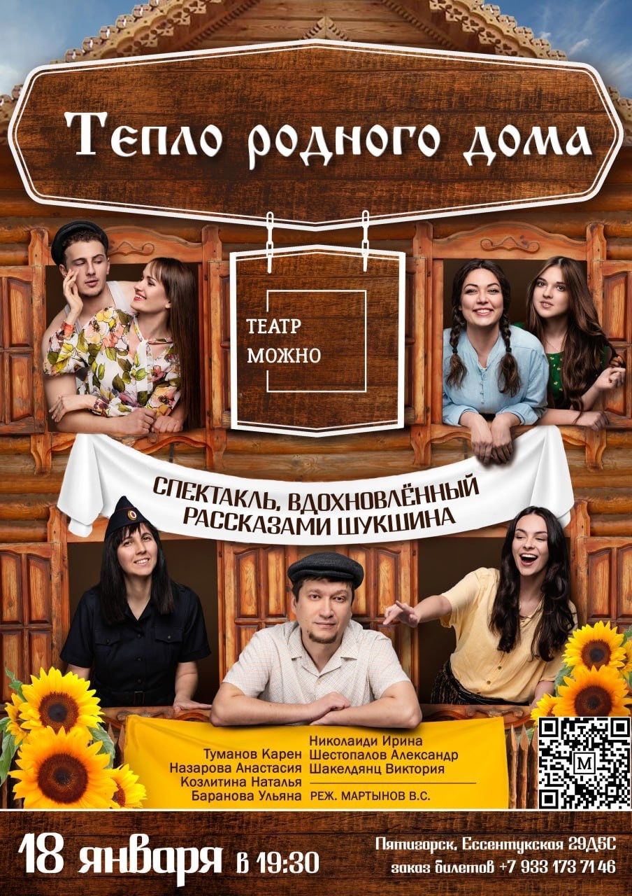 В холодный январский вечер мы приглашаем вас согреться у огня душевных историй Василия Макаровича Шукшина- певца русской деревни, последнего гения русской литературы, хранителя народной мудрости и тонкого знатока человеческих сердец. "Тепло родного дома"-это лирическая комедия-мозаика, сотканная из пяти рассказов великого писателя. Это путешествие в мир, где смех идёт рука об руку со слезами, где за внешней простотой скрывается глубина, а за грубоватостью — необыкновенная нежность. Семь актёров на ваших глазах совершают настоящее волшебство — превращаются из персонажа в персонажа, проживая судьбы деревенских чудаков, городских мечтателей, простых людей с непростыми характерами. Каждый актёр- это целая галерея образов, каждое перевоплощение, маленькое чудо театрального искусства. Это спектакль, где вы будете смеяться над чудачествами героев и одновременно чувствовать лёгкую грусть по тому миру, которого уже нет. Шукшин умел находить комическое в трагическом и трагическое в смешном — мы сохранили эту удивительную интонацию. Мы не просто показываем рассказы — мы воспитываем душу. В эпоху, когда человечность становится редким качеством, когда искренность считают слабостью, а доброту-глупостью, шукшинские герои напоминают: настоящая сила-в способности оставаться человеком. В умении чувствовать, сопереживать, прощать. В том самом тепле родного дома, которое каждый носит в сердце. Билеты уже в продаже! Согрейте свою душу этой зимой. "Тепло родного дома" ждёт вас. Спектакль рекомендуется всем, кто устал от холода большого города и ищет тепло настоящего искусства. Не пропустите 18 января – вечер настоящих эмоций! Начало в 19:30