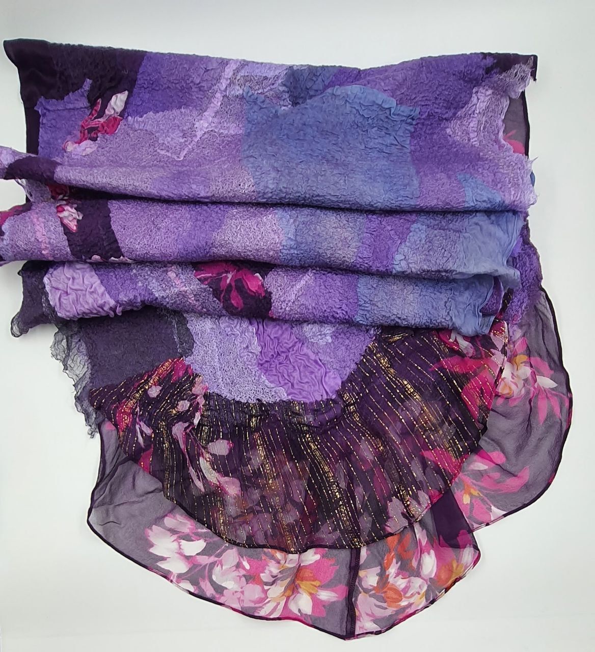 Нежный палантин, свалянный в технике нунофелтинг: тонкая мериносовая шерсть “впаяна” в натуральный шелк, создавая живую фактуру и мягкую, текучую драпировку. Градиенты фиолетового, сиреневого и лавандового переливаются, как акварель, — от глубоких вечерних оттенков к нежному утру. Лёгкий, но тёплый, он укроет в прохладный вечер и добавит благородного акцента к пальто, платью или джинсам. Каждый палантин уникален: рисунок формируется вручную и не повторяется. Уход: бережная ручная стирка в прохладной воде с мягким средством, без отжима, сушить на плоскости.