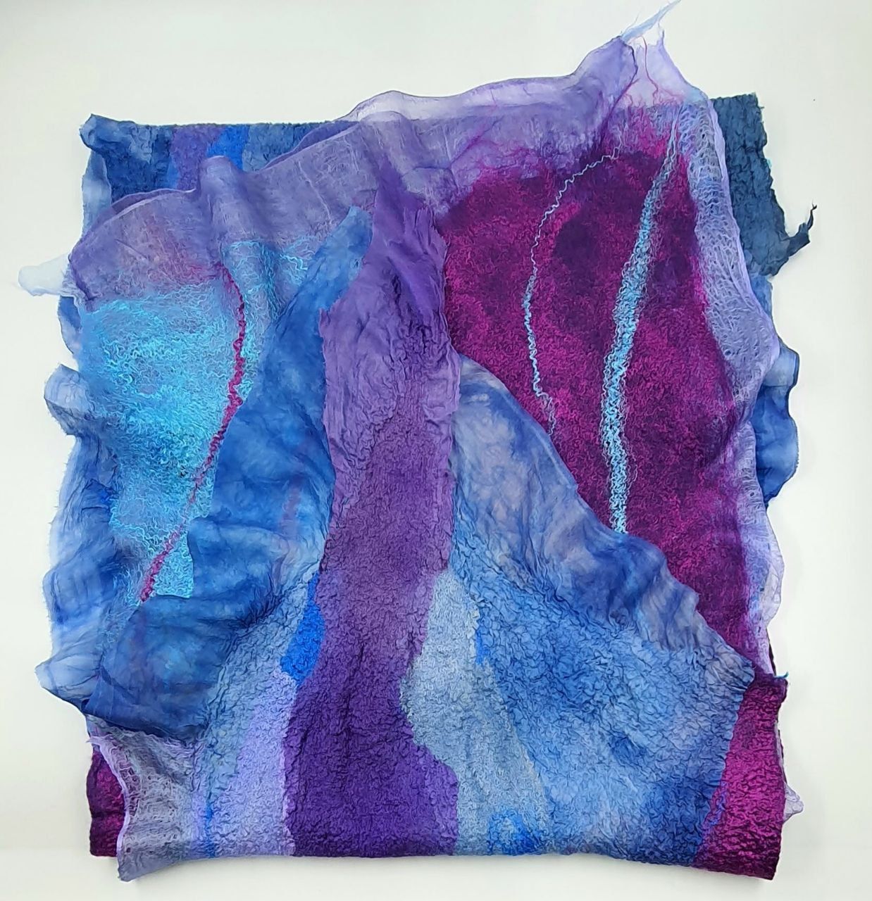 Нежный палантин, свалянный в технике нунофелтинг: тонкая мериносовая шерсть “впаяна” в натуральный шелк, создавая живую фактуру и мягкую, текучую драпировку. Градиенты синего, сиреневого и небесно-голубого переливаются, как акварель, — от глубоких вечерних оттенков к нежному утру. Лёгкий, но тёплый, он укроет в прохладный вечер и добавит благородного акцента к пальто, платью или джинсам. Каждый палантин уникален: рисунок формируется вручную и не повторяется. Уход: бережная ручная стирка в прохладной воде с мягким средством, без отжима, сушить на плоскости.